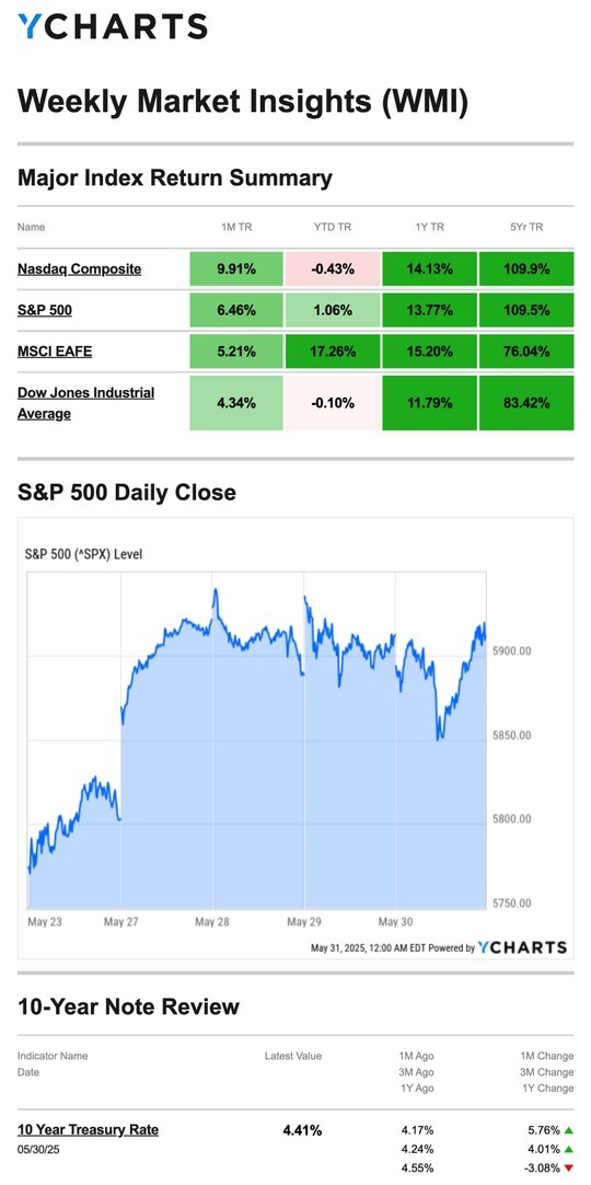 Source: YCharts.com, May 31, 2025. Weekly performance is measured from Friday, May 23, to Friday, May 30. TR = total return for the index, which includes any dividends as well as any other cash distributions during the period. Treasury note yield is expressed in basis points. |