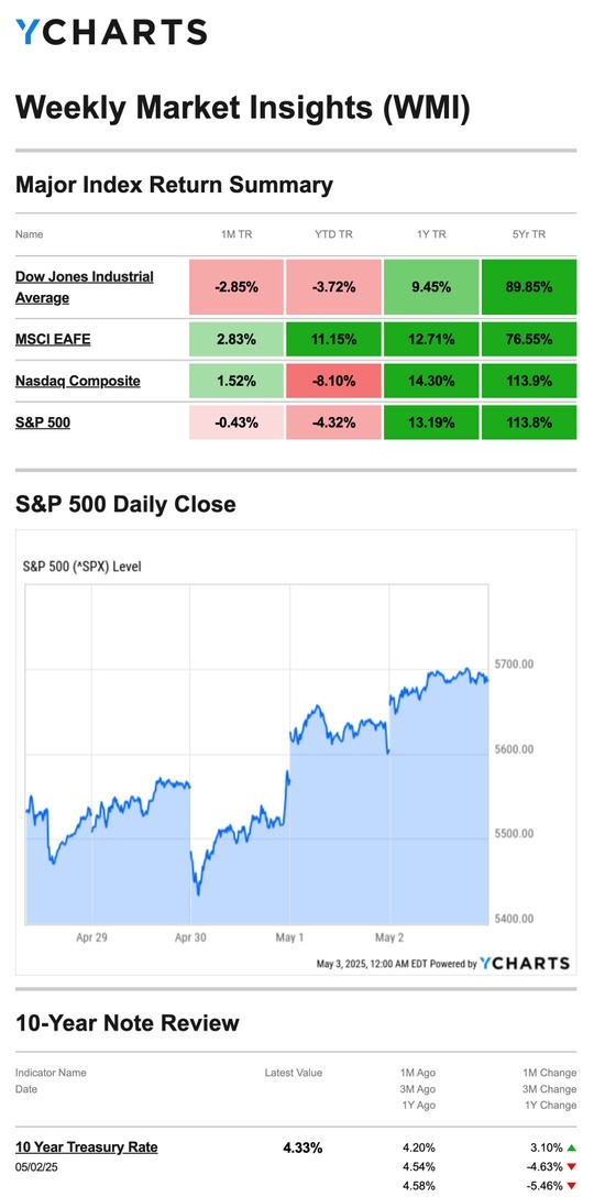 Source: YCharts.com, May 3, 2025. Weekly performance is measured from Tuesday, April 29, to Friday, May 2. TR = total return for the index, which includes any dividends as well as any other cash distributions during the period. Treasury note yield is expressed in basis points. |