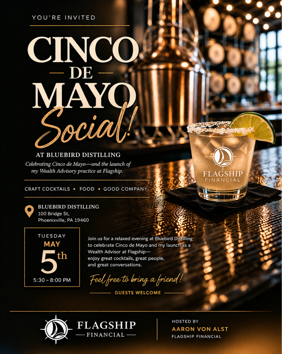 You're Invited! Please join us for a Cinco de Mayo Social Happy Hour on Tuesday, May 5th from 5:30PM - 8:00PM at Bluebird Distilling celebrating Cinco de Mayo and the launch of Aaron Von Alst's Wealth Advisory practice with Flagship Financial. Feel free to bring a guest and come enjoy a relaxed evening with great cocktails, great people, and great conversations!